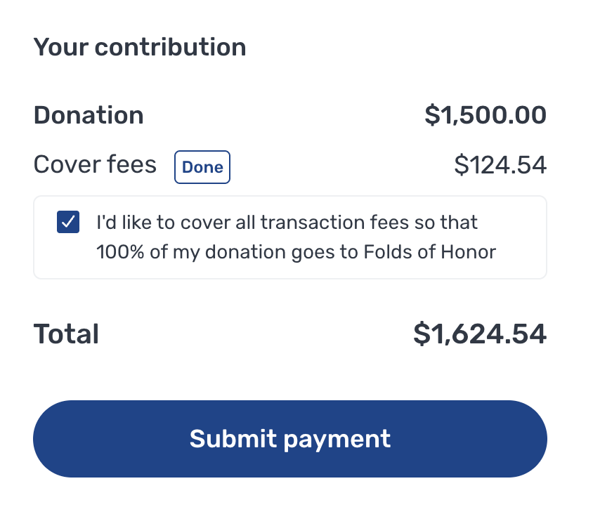 The standard credit card processing fee for charitable donations is 2.9% plus 30 cents. However, when you stack the platform fee, the gateway fee, and the administrative layer on top of that 2.9%, the “cover the fees” checkbox becomes effectively mandatory - or the organization will be routinely losing 5-10% per transaction.