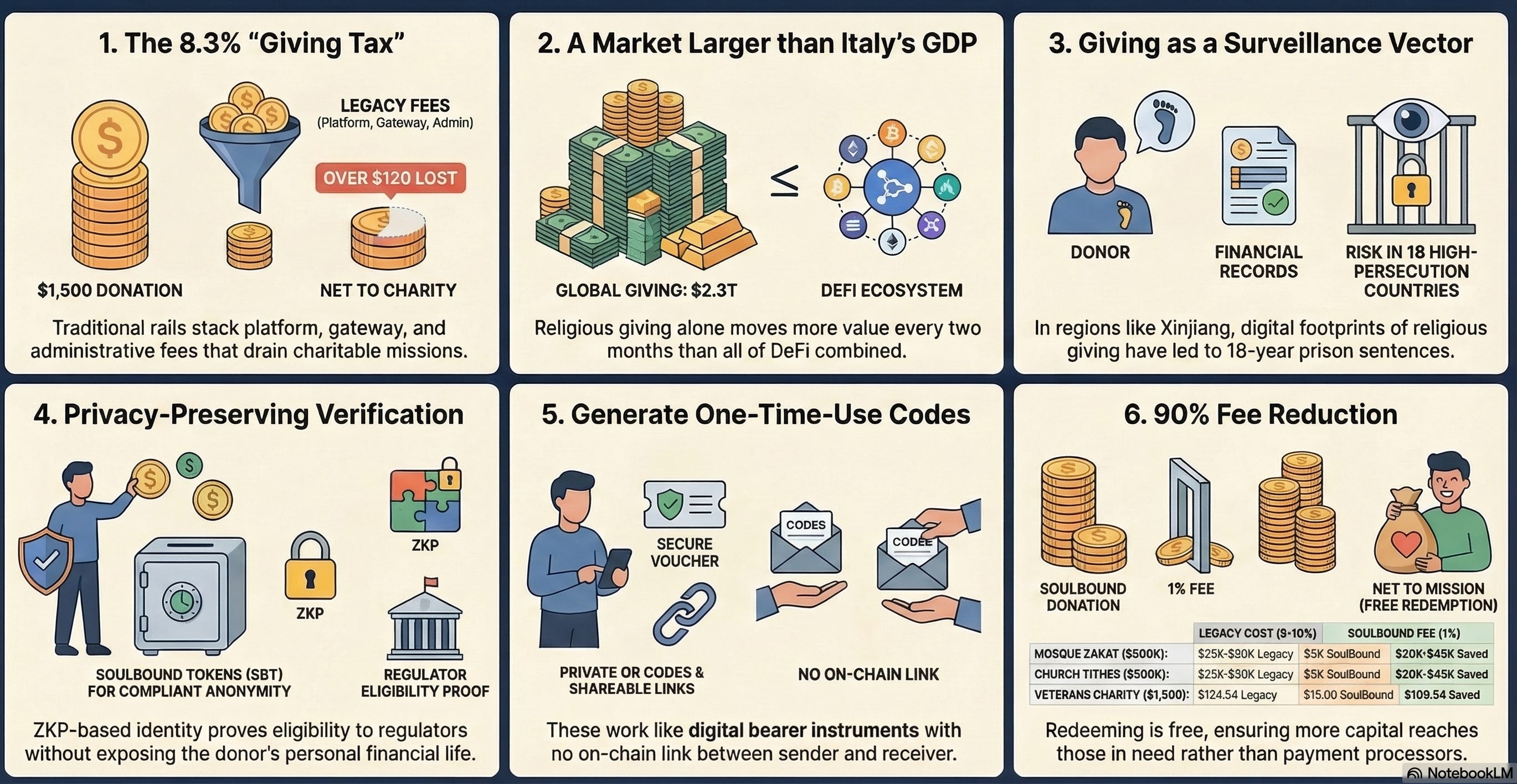 The communities that need this most are operating outside Western regulatory jurisdictions — where payment infrastructure extracts the most, where financial privacy carries the highest stakes, and where $1 trillion in annual giving is waiting for a better rail.